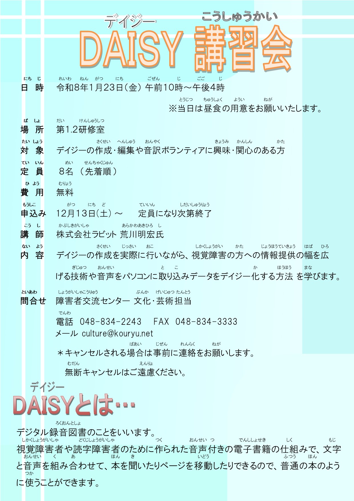 内容 デイジーの作成を実際に行いながら 視覚障害の方への情報提供の幅を広げる技術や