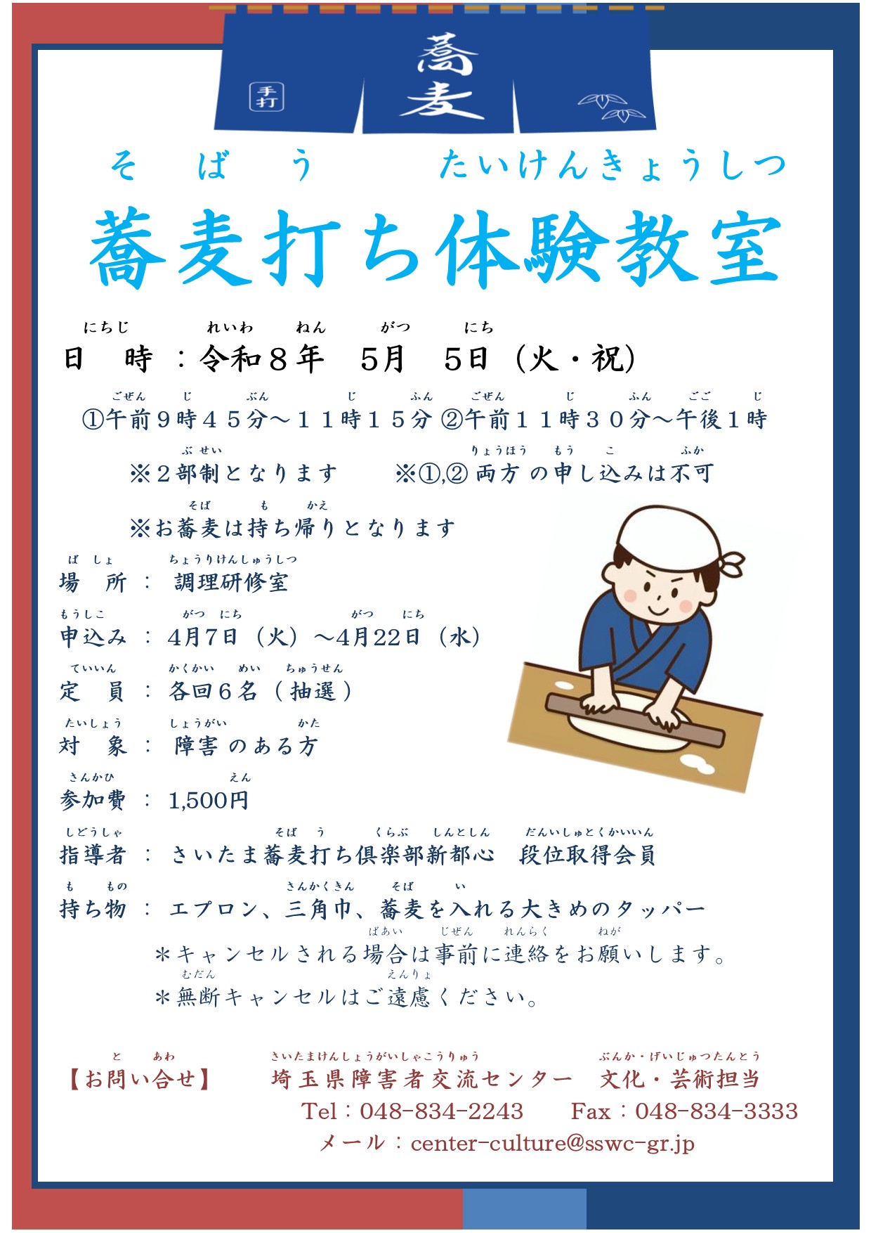 蕎麦打ち体験教室を開催します