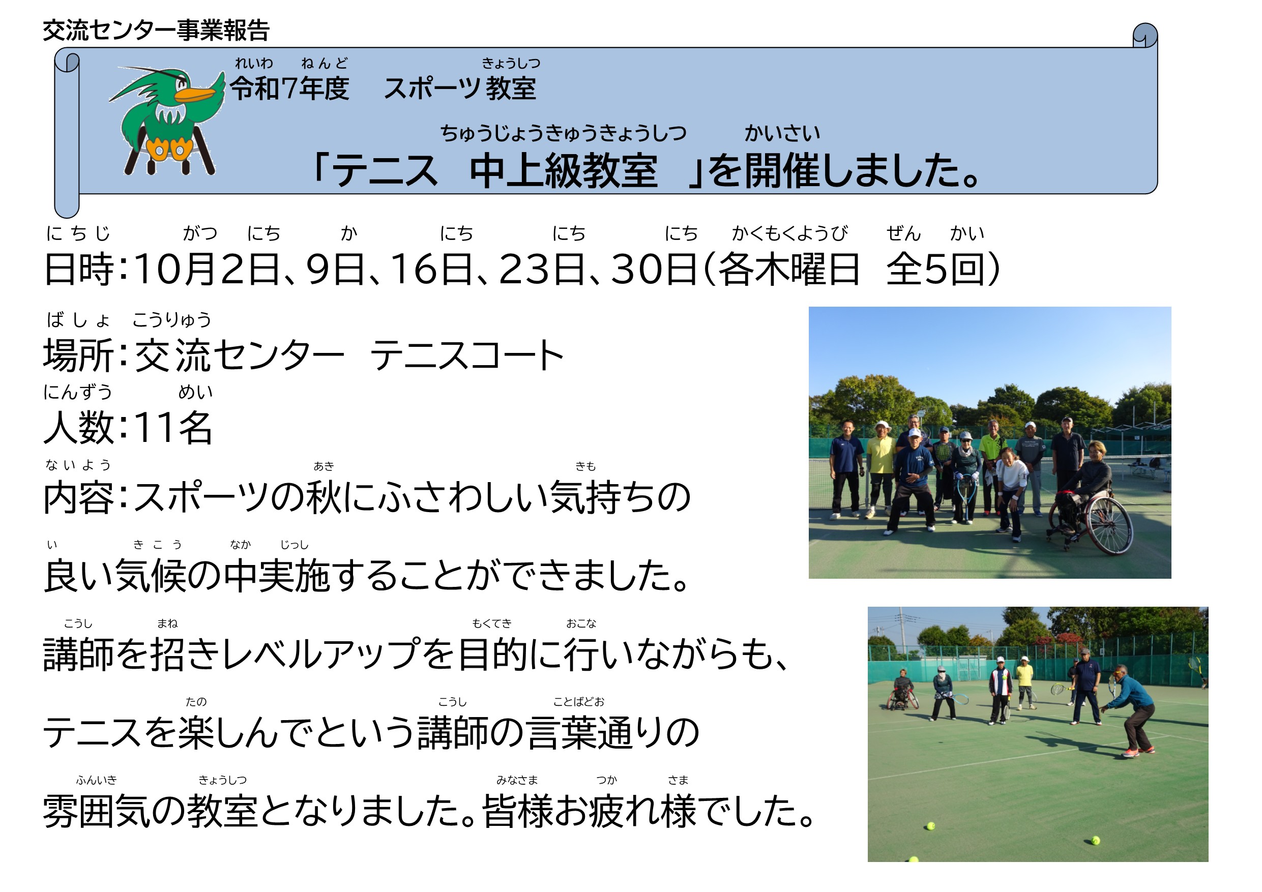 講師を招きレベルアップを目的に行いながらも、テニスを楽しんでという講師の言葉通りの雰囲気の教室となりました。皆様お疲れ様でした。