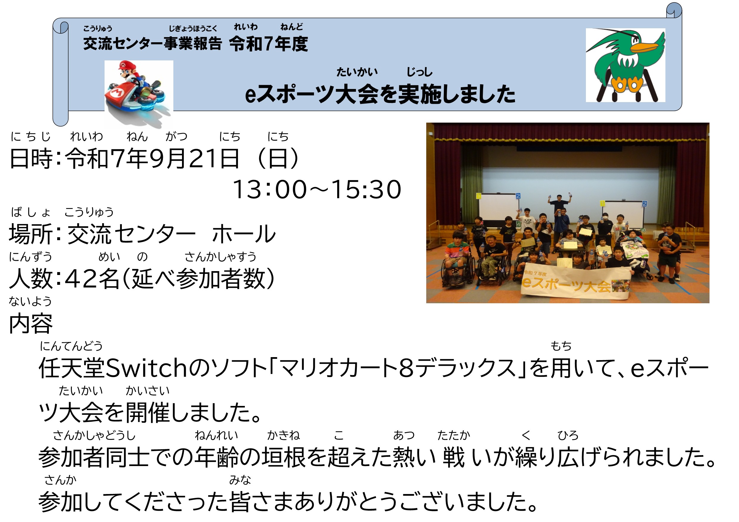 内容:任天堂Switchのソフト「マリオカート8デラックス」を用いて、eスポーツ大会を開催しました。