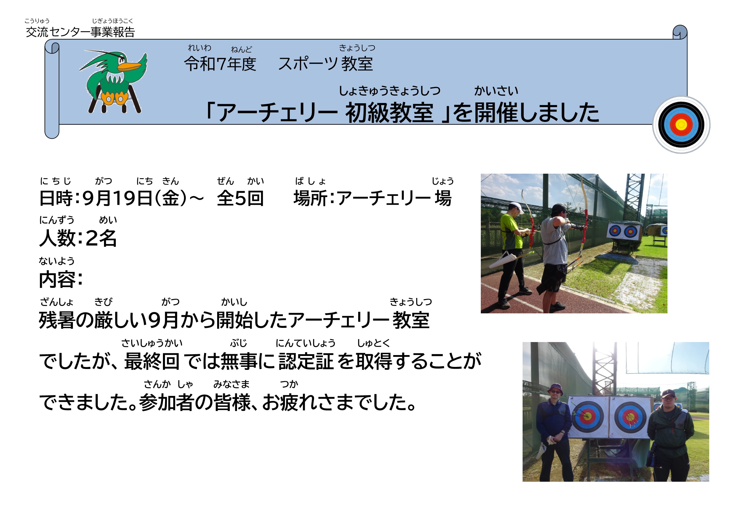 内容:残暑の厳しい9月から開始したアーチェリー教室