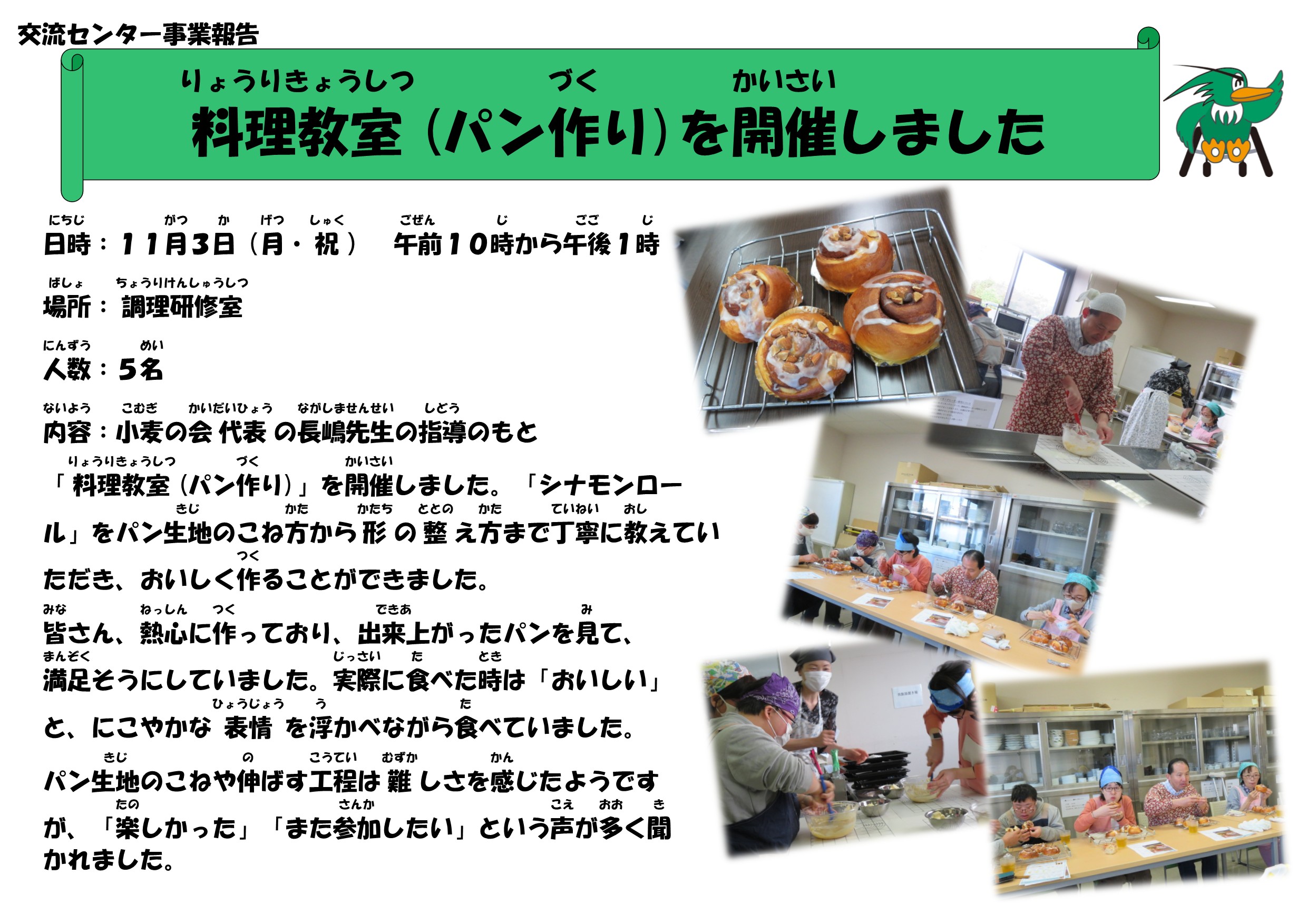 内容 小麦の会代表の長嶋先生の指導のもと「料理教室(パン作り)」を開催しました