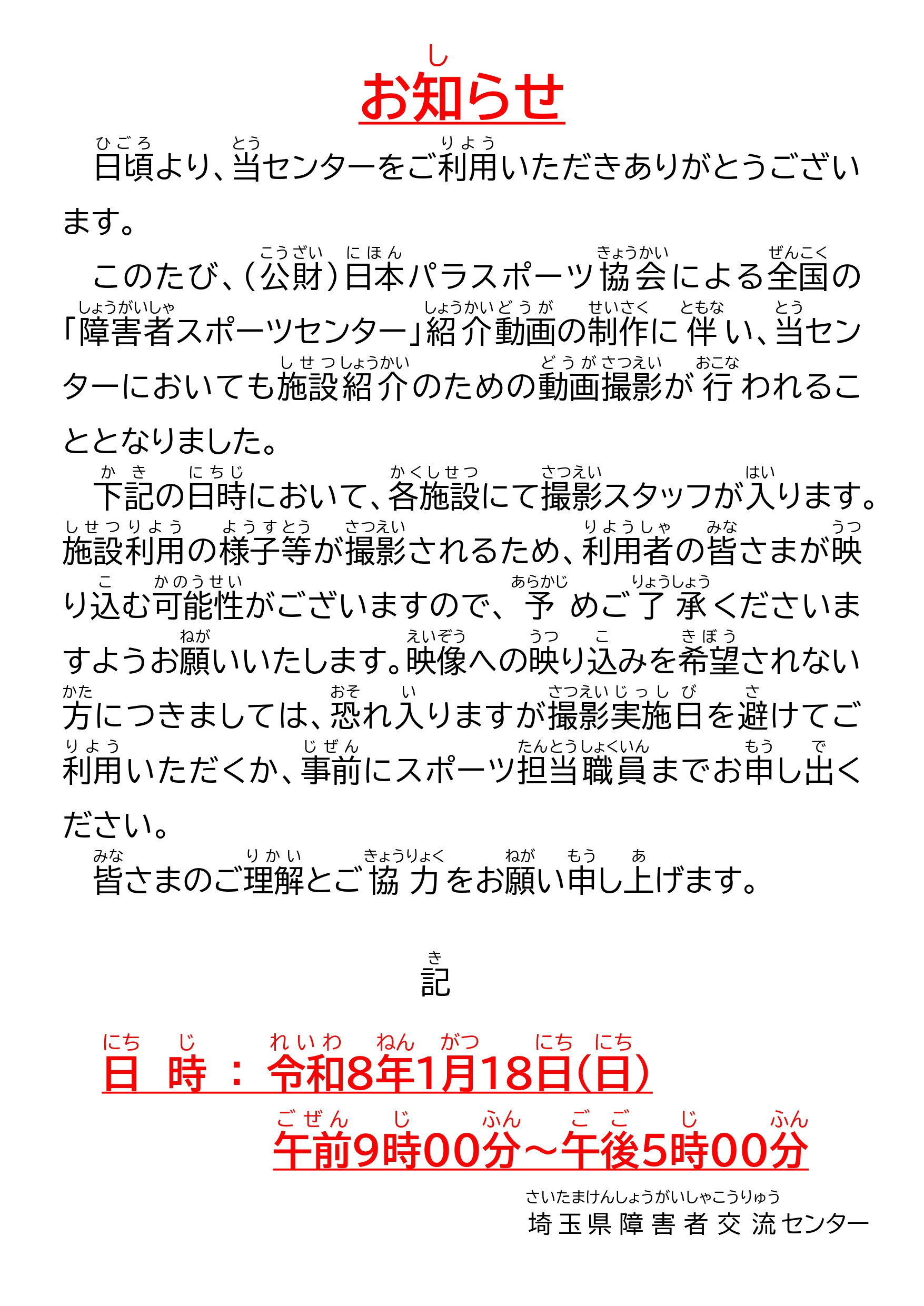 このたび、(公財)日本パラスポーツ協会による全国の「障害者スポーツセンター」紹介動画の制作に伴い、当センターにおいても施設紹介のための動画撮影が行われることとなりました。