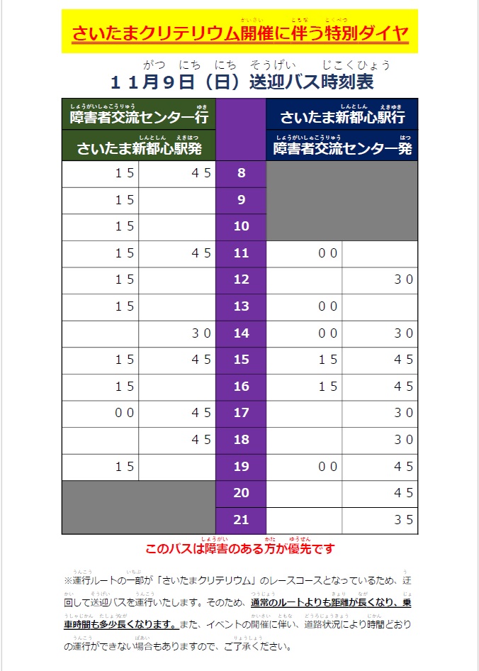運行ルートの一部がさいたまクリテリウムのレースコースとなっているため、迂回して送迎バスを運行いたします。